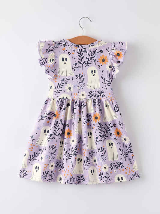 Halloween Ghost Floral Print Purple Ruffled Girls Pajamas