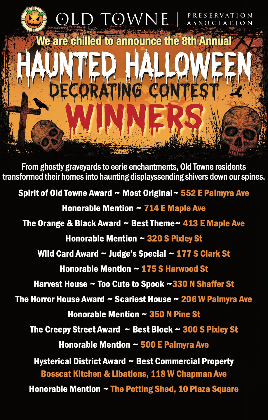 Dust off your cobwebs and unleash your spooky spirit—Old Towne is about to get frightfully festive! Do you dare to be crowned among the most boo-tiful, bone-chilling, and creatively creepy homes in town?