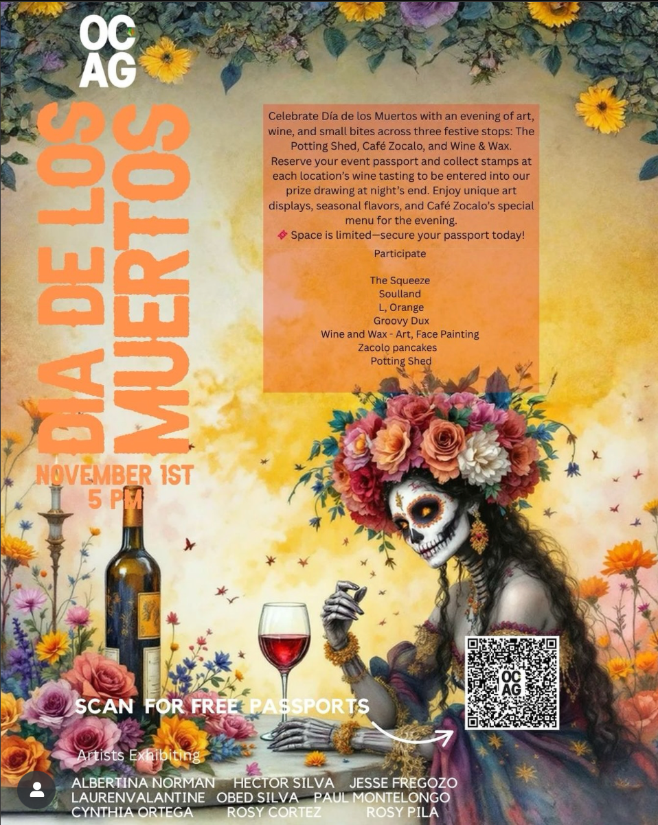 A Free Event: by OCAG, the Orange Community Arts Guild, is celebrating Día de los Muertos with an event in Old Towne Orange on November 1, starting at 5 p.m. The event will include the creation of altars (ofrendas), live art, music, face painting, and food, with activities and entertainment in participating Old Town Orange locations. Proceeds from participating merchants support OCAG's community art programs.