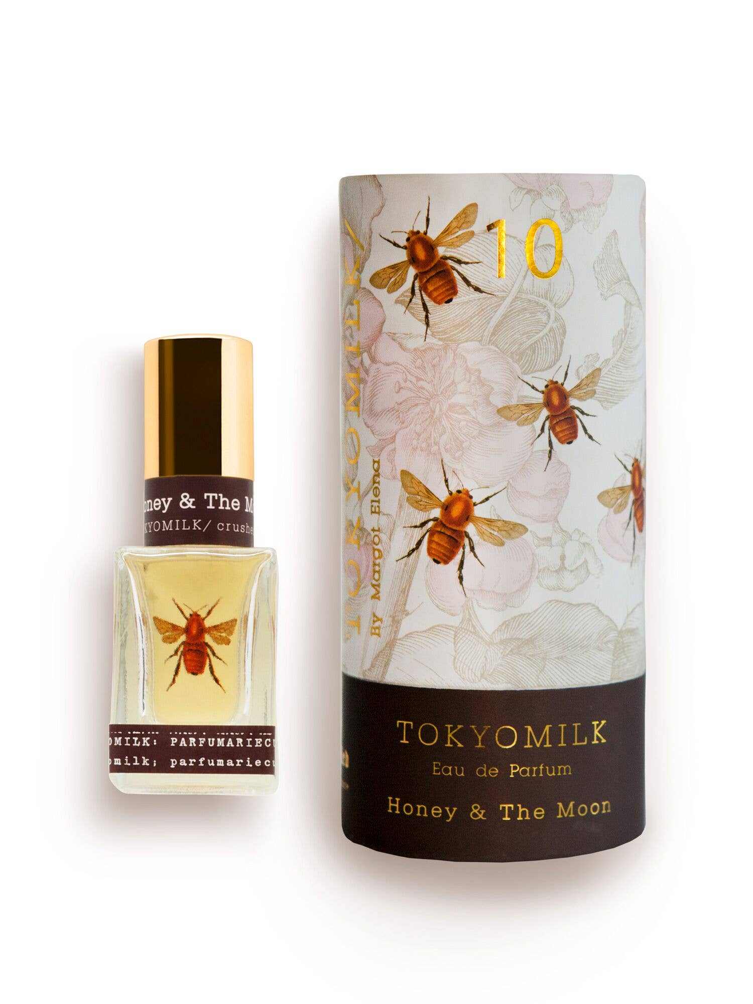 Tokyomilk Honey and the Moon No. 10 Parfum offers a gently sweet blend of honey, sugared violet, jasmine, and sandalwood. This unique scent is part of a charming collection, presented in a captivating glass bottle adorned with a lively summer bee. Bottle size: 1.25" square by 4" tall. Box dimensions: 5.5" high by 2.5" wide.