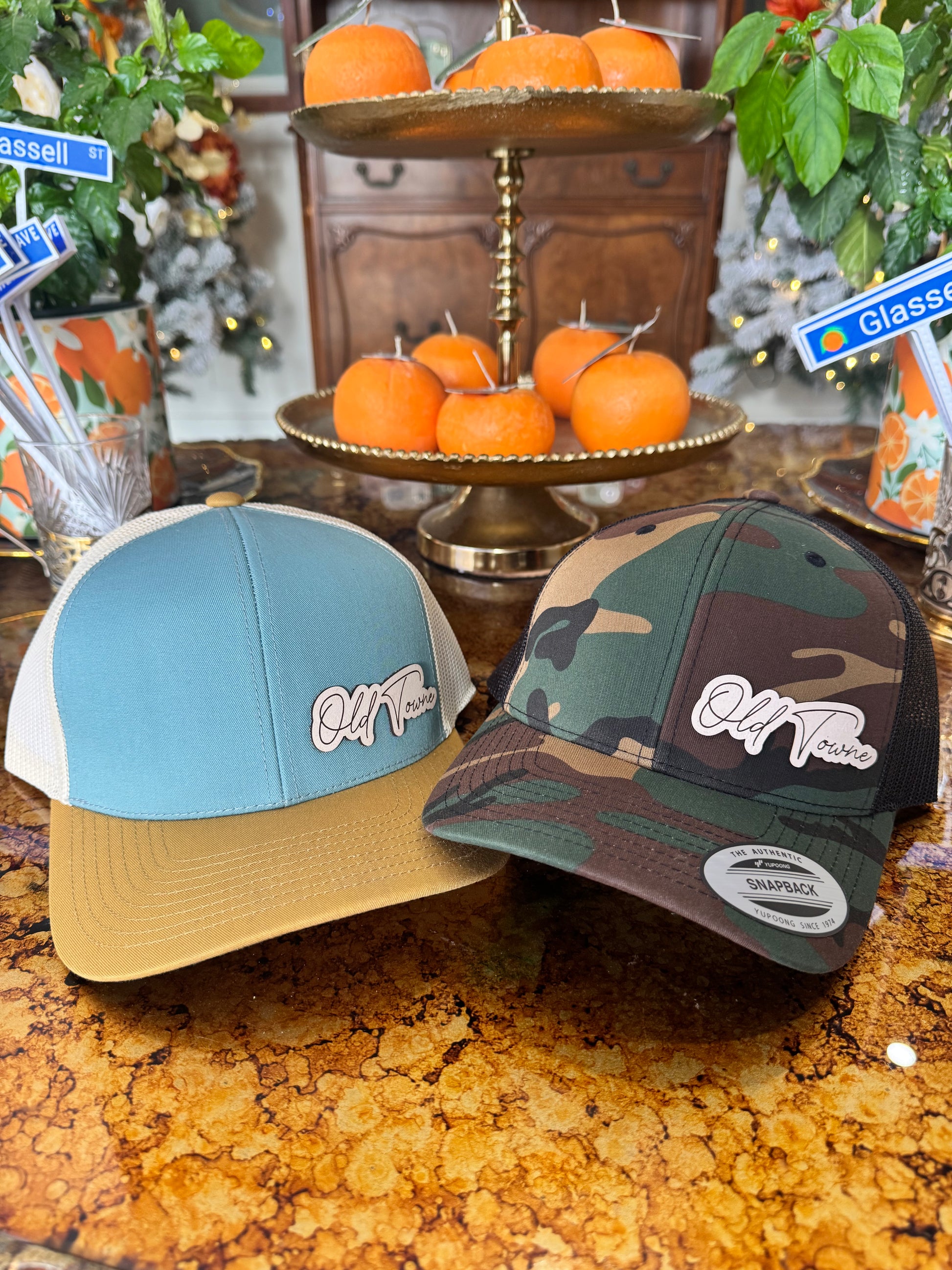 The Old Towne Leather Engraved Hat delivers authentic craftsmanship in two commanding colorways: smoke blue and camo.